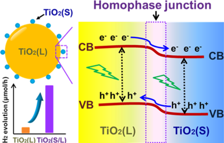 光催化剂中“结”的构建可以形成内建电场,进而有效促进光生电荷分离。为了探究能够将光生电荷分离的最小的能带差异(即诱导光生电荷分离的驱动力的极限最低值),本文以经典半导体 TiO2 为模型,根据纳米限域效应,利用不同尺寸 TiO2 的表面能带弯曲程度的差异,在大、小尺寸 TiO2 之间构建了“同相结”。发现虽然大、小尺寸 TiO2 之间能带差异非常微小,但是“同相结”的形成也能有效促进光生电荷分离和迁移。这为“结”型光催化剂的研究增添了一项以微小内建电场为研究对象的崭新课题,对设计与调控光催化材料具有重要的参考价值。