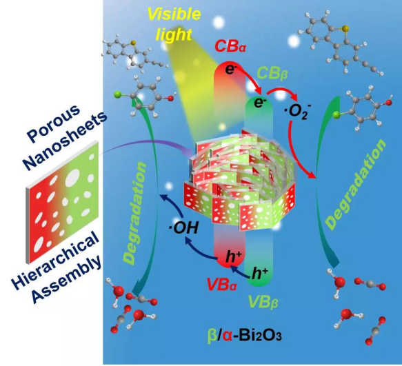 为解决这个难题,张静课题组以备受关注的、可见光响应的氧化铋(Bi2O3)光催化剂为例展开了研究工作。她们通过控制醋酸氧铋(BiOAc)的沉淀过程,从而自组装合成了花状形貌BiOAc。进一步以花状BiOAc为自模板,通过调控热处理温度,一方面利用其在热处理时溢出CO2气体形成了花状的多级孔结构,另一方面促使β-Bi2O3相变为α-Bi2O3形成了α/β-Bi2O3“异相结”,从而促成了“异相结”与多级孔结构的有机结合。因为多级孔结构将α/β-Bi2O3“异相结”暴露于材料表面,其更多裸露的光催化活性位点能够高效地完成光生电荷分离过程,使得光催化降解高浓度废水的性能获得了数量级的提升。该工作通过设计BiOAc自组装模板,合成了具有多级孔形貌的β/α-Bi2O3异相结材料,为“异相结”与微纳米形貌的同步合成提供了新思路,有利于将“异相结”与微纳形貌的优势有机结合,从而大幅度提高光生电荷分离效率及光催化性能。